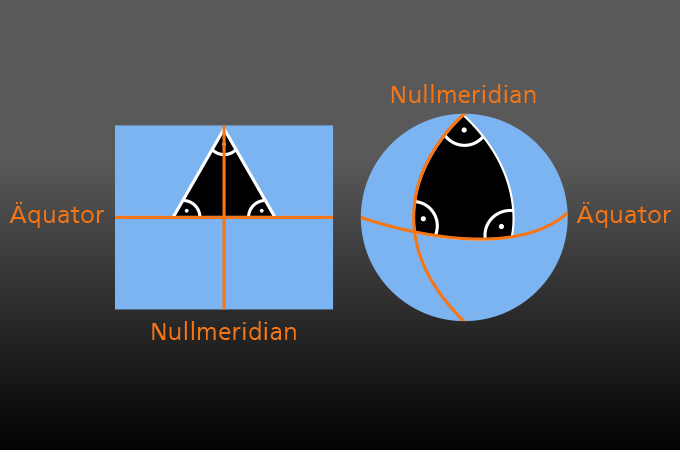 In einem Dreieck ergeben die drei Winkel, an denen sich die Seiten berühren, zusammen immer 180 Grad. Das ist die sogenannte Winkelsumme. Auf einem Blatt Papier kann man das mit einem einfachen Geodreieck leicht nachmessen. Das gilt aber nur für ebene Flächen. Auf einer Kugel ist diese Winkelsumme größer, weil die Linien und Winkel verzerrt sind. Bis hierhin sind sich Flacherde- und Kugeltheoretiker ausnahmsweise mal einig. Das heißt aber auch: Wäre die Erde wirklich eine Kugel, dann müsste ein Dreieck mit drei sehr langen Seiten (auf kurzen Strecken macht das keinen Unterschied) wie etwa dem Äquator, dem Nullmeridian und dem 90. Längengrad eine Winkelsumme von 270 Grad haben. So weit so gut. Die Kugel-Theoretiker könnten daher leicht beweisen, dass sie recht haben: Sie müssten lediglich mit einem etwas dickeren Filzstift diese Linien auf die Erdoberfläche auftragen und dann die Winkel nachmessen. Das tut aber niemand! Nirgendwo entlang des Äquators – wir sind die gesamte Strecke mehrfach abgegangen und haben es vor Ort überprüft – findet sich irgendeine Filzstift-Linie! Auch auf der Meeresoberfläche nicht – und dass man dort keine Linie aufs Wasser malen kann, ist eine faule Ausrede, da es bekanntlich wasserfeste Stifte gibt! Also: Warum treten die Kugel-Verschwörer nicht diesen simplen Beweis an? Die Antwort ist offensichtlich: Weil es eben nicht so ist, wie sie behaupten!