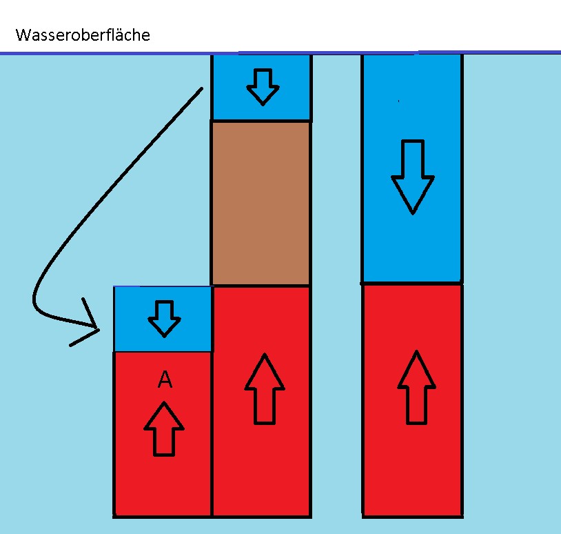 Um genauer zu verstehen, was der Auftrieb ist, stellen wir uns einmal folgendes Beispiel vor: Ein quaderförmiger Körper ist ganz ins Wasser eingetaucht und gerade ausgerichtet, wie in diesem Bild gezeigt (hier braun von der Seite zu sehen). Neben den Quader haben wir dunkelblau eine Wassersäule gezeichnet, die genau so groß ist wie der Quader zusammen mit dem Wasser, das sich über ihm befindet. Diese Wassersäule sorgt an ihrem unteren Ende für eine Druckkraft, die so groß ist wie das Gewicht der Wassersäule. Aus der Beobachtung, dass das Wasser an der Unterseite der Säule ganz stillsteht, können wir schließen, dass der Wasserdruck an dieser Stelle genauso stark nach oben wirkt. Den Druck nach oben haben wir mal als rote Wassermasse eingezeichnet. Weil der Druck in gleichen Wassertiefen gleich ist, können wir denselben Druck auch unter den Quader zeichnen. Das ist der Wasserdruck, der den Quader anheben will. Allerdings ist dies noch nicht der Auftrieb; denn das Wasser über dem Quader drückt ja nach unten, und das müssen wir wieder von dem roten „Auftriebswasser“ abziehen, was wir in der ganz linken Spalte der Zeichnung gemacht haben. Wenn man nun genau hinschaut, ist der rote mit A bezeichnete Quader des verbliebenen Auftriebswassers genau so groß wie der Quader. Damit haben wir das Gesetz für den Auftrieb, das zu Ehren seines Entdeckers Archimedisches Gesetz heißt, für quaderförmige Körper eingesehen. Es sagt, dass der Auftrieb eines Körpers unter Wasser genau so groß ist wie das Gewicht des Wassers, das an der Stelle war, bevor er hineingehalten wurde. Man nennt dies das vom Körper verdrängte Wasser.