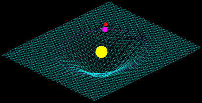 Dass ein Himmelskörper den Raum um sich herum verbiegt oder krümmt, kann man sich schwer vorstellen. Diese Animation zeigt das aber recht gut. Da bildet die Sonne mit ihrer großen Masse eine „Kuhle“ im Raum. So zieht sie die Erde an, die dadurch auf ihrer Bahn bleibt. Auch die Erde erzeugt eine kleine Kuhle und hält so den Mond auf seiner Bahn. Die Animation hat nur einen kleinen Schönheitsfehler: Der Mond muss sich anders als hier gegen den Uhrzeigersinn um die Erde bewegen.