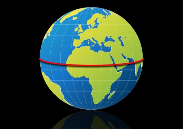 Für eine ganze Umdrehung braucht die Erde 24 Stunden. Und wir alle drehen uns mit ihr mit. Wie schnell sind wir wohl dabei? In diesem kleinen Gedankenspiel bleiben wir an einem Ort stehen, laufen also nicht über die Erdoberfläche. Jetzt drehen wir uns zusammen mit der Erdkugel. Stell dir mal vor, du würdest am Äquator stehen – also an der Linie, die am „Bauch“ um die ganze Erde herumführt und die wir hier mal eingezeichnet haben.