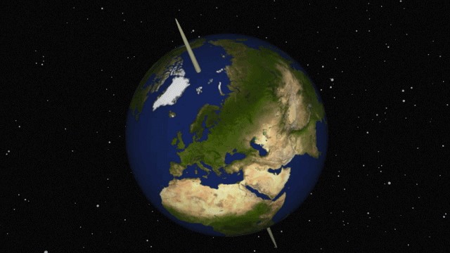 Die Erde dreht sich um sich selbst. Genauer um ihre Achse. Man sagt auch, dass die Erde „rotiert“ und diese Drehbewegung nennt man „Rotation“. Die Erdachse kannst du dir wie einen längeren Holzspieß vorstellen, den du durch einen Apfel steckst: oben am Nordpol rein und unten am Südpol wieder raus. Du kannst das als Mini-Versuch ja mal nachmachen – oder du stellst es dir nur in Gedanken vor. Wenn du eine Taschenlampe als Sonne nimmst und es ansonsten ganz dunkel im Zimmer ist, siehst du, wie es auf der Apfel-Erde Tag und Nacht wird. Leg die Taschenlampe auf einen Tisch, sodass sie deine Apfel-Erde von der Seite anstrahlt. Auf der einen Hälfte der Erde ist Tag, auf der anderen Nacht. Drehst du jetzt langsam oben oder unten am Holzspieß, kommen allmählich andere Gebiete deiner Apfel-Erde auf die Sonnenseite. Du kannst ja mal irgendwo einen Ort markieren – vielleicht mit einem kleinen Loch, das du in die Schale stichst. Dann siehst du, wie sich diese Stelle mal in der Sonne befindet und es dort Tag ist und wie sich der Ort dann nach einiger Zeit mit der Apfel-Erde auf die Nachtseite dreht. Noch ein Satz zu der Richtung, in der du die Apfel-Erde drehen musst: Wenn du von oben auf den Nordpol der Erde schaust, dreht sie sich gegen den Uhrzeigersinn.