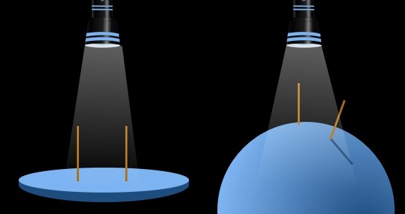 Zurück zur Erdkugel: Wie die Menschen schon vor über 2.000 Jahren herausgefunden haben, dass die Erde eine Kugel ist, hat Sina in ihrem Video erklärt. Da erwähnt sie auch das Mini-Experiment mit den beiden Zahnstochern, mit dem du einen berühmten Versuch aus der damaligen Zeit (hier stark vereinfacht und etwas abgewandelt) selbst im Kleinen nachmachen kannst. Beim ersten Durchgang steckst du die Zahnstocher senkrecht in eine Scheibe, beim zweiten in eine Kugel. Wenn du dann mit einer Taschenlampe als Sonne von oben darauf leuchtest, wirst du sehen: Bei einer Scheibe als „Erde“ wirft keiner der beiden Zahnstocher einen Schatten – sie zeigen ja beide genau zur Sonne hoch über ihnen. Aber bei einer Kugel, auf der einer der beiden Zahnstocher exakt zur „Sonne“ zeigt, steht der andere immer etwas „schief“, sodass er einen kurzen Schatten wirft. Genau das ist auch bei dem historischen Experiment vor über 2.000 Jahren passiert: In einer Stadt warf eine Säule keinen Schatten, weil die Sonnenstrahlen genau senkrecht von oben auf sie fielen. In einer anderen weiter entfernten Stadt sah man dagegen zur selben Zeit einen kurzen Schatten. Und weil das nur bei einer Kugel klappt, war damit die Kugelform der Erde bewiesen. Hier nochmal der Versuchsaufbau für dein Zahnstocher-Experiment: