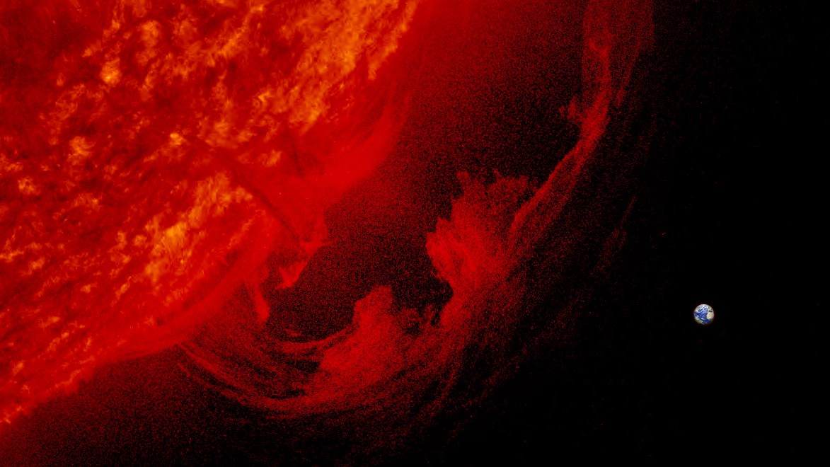 Auf der „Helioviewer“-Seite (Link im Text) kannst du die Satellitenbilder der Sonne selbst auswählen und bearbeiten. Dabei lassen sich Movies erstellen oder auch wie hier besonders spektakuläre Szenen im Bildausschnitt festhalten. Es gibt da auch einen „Klick“, mit dem man ein Bild der Erde zum Größenvergleich einfügen kann.