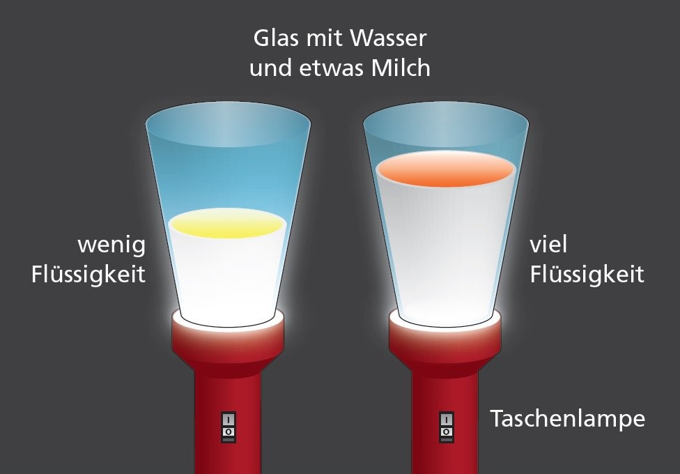 Wenn das Sonnenlicht beispielsweise abends einen sehr langen Weg durch die Lufthülle der Erde zurücklegt, kommt fast nur noch das langwellige rote Licht bei uns an. Und genau das kannst du – wiegesagt am besten zu zweit mit einem Freund oder einer Freundin – in folgendem Experiment nachmachen: Nehmt eine Taschenlampe als Sonne und ein Glas mit Wasser und etwas Milch als Atmosphäre. Diese Wasser-Milch-Mischung gebt ihr vorab in eine Kanne – mit viel Wasser und nur etwas Milch. Die Fett-Teilchen in der Milch stellen hier in diesem Modell die Teilchen in der Atmosphäre dar. Leuchtet nun in einem dunklen Raum mit der Taschenlampe von unten in das Glas. Füllt erst etwas von der Wasser-Milch-Mischung ein und schaut von oben ins Glas. Dann schüttet ihr etwas mehr von der Flüssigkeit nach und betrachtet die Sache wieder von oben. Macht das mehrmals und achtet dabei auf die Farbe des Lichts an der Oberfläche. Je mehr Flüssigkeit im Glas ist, desto weiter ist der Weg des „Taschenlampen-Sonnenlichts“ durch die „Milch-Atmosphäre“ – und umso stärker färbt sich das Licht rötlich wie es auch bei Sonnenuntergang passiert.