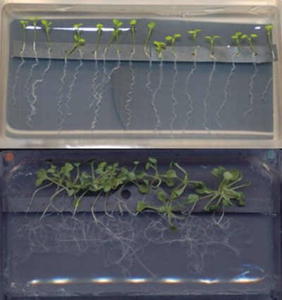 Ohne die Erdanziehung sinken die Körnchen nicht mehr nach unten. Die Pflanze verliert dadurch gewissermaßen die Orientierung. Daher wachsen die Wurzeln jetzt nicht mehr in eine bestimmte Richtung, sondern ganz zufällig in alle möglichen Richtungen. Das erkennst du gut an den Fotos von einem Experiment, das im Jahr 2008 in einem Labor auf der Erde und zum Vergleich auch auf der ISS durchgeführt wurde. Beim Versuch auf der Erde (oberes Bild) wachsen die Wurzeln der Pflanze namens „Acker-Schmalwand“ wie üblich schön gerade nach unten, in Schwerelosigkeit (unteres Bild) in alle Richtungen.