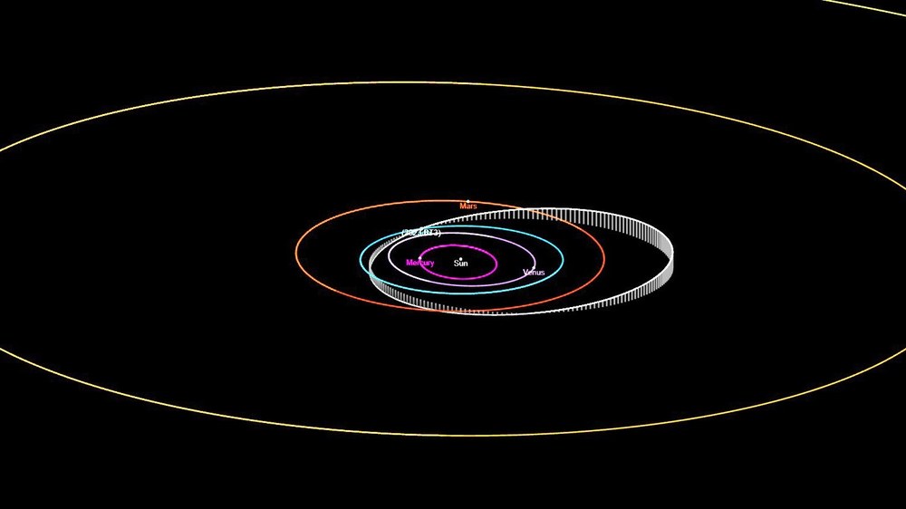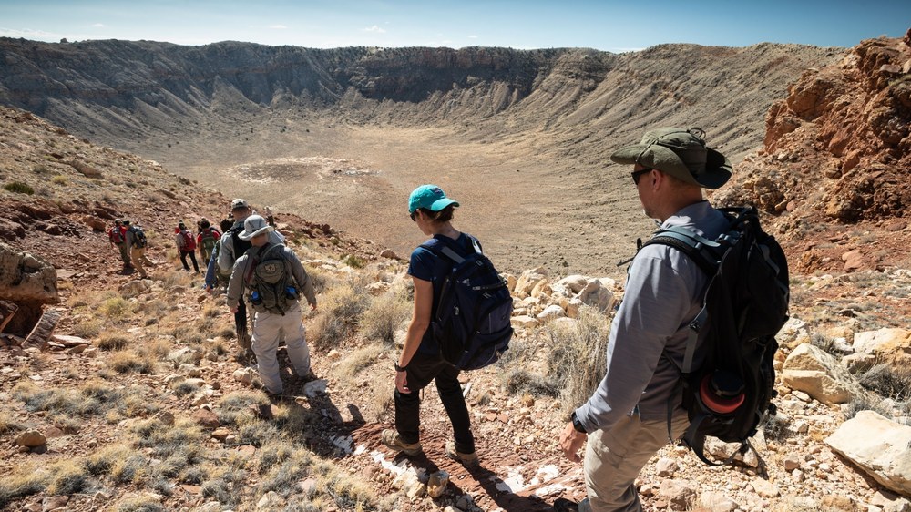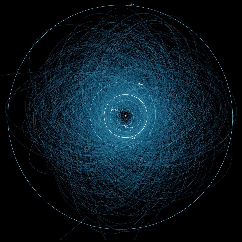 Jetzt aber zu den ganz großen Einschlägen: Asteroiden können einige hundert Meter oder sogar mehrere Kilometer groß sein. Normalerweise kreisen sie zwischen den Bahnen von Mars und Jupiter um die Sonne – im sogenannten Asteroidengürtel. Auch weiter draußen am Rand des Sonnensystems gibt es unzählige Asteroiden. Insgesamt dürften es viele Millionen sein – die meisten weit von uns weg. Aber einige Asteroiden nähern sich ab und zu der Erde. Vielleicht sind sie irgendwann mit einem anderen Asteroiden zusammengestoßen und dabei abgelenkt worden. Oder sie sind bei einem solchen Zusammenstoß in mehrere Teile zerbrochen, die dadurch auf einen anderen Kurs gebracht wurden. Und so kreuzen einige von ihnen manchmal auch die Bahn der Erde – meistens in großem Abstand, manchmal bedrohlich nah.