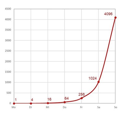Man kann daraus ablesen, wie viele Infizierte es an einem Tag gibt: Nach sechs Tagen wären es 4.096 Infizierte. Ähnliche Infektionskurven kann man im Internet finden. Zunächst nimmt die Anzahl der Infizierten kaum merklich zu, aber dann geht es geradezu explosionsartig weiter. Die Kurve wird immer steiler und steiler: Jeden Tag werden immer mehr und mehr Personen infiziert.