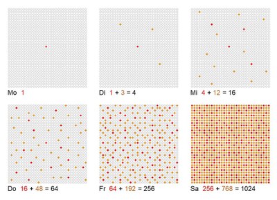 Da der Corona-Erreger beim Ausbruch der Pandemie neu war, wusste man damals noch nicht so viel darüber. Darum schwankten die Angaben zur Reproduktionszahl (bei der Corona-Pandemie war sie nicht so hoch wie in unserem Beispiel mit den Punkten). Aber zum Glück ist das schon lange her. Und weil es ja auch kein schönes Thema ist, kommen wir jetzt lieber zu einem anderen Beispiel.