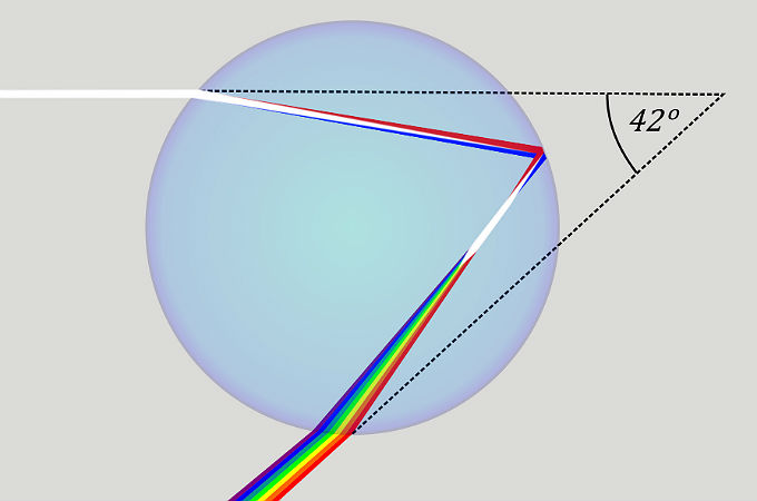 Das Sonnenlicht sieht weiß aus. Aber eigentlich besteht es aus vielen verschiedenen Farben, die eben alle zusammen weißes Licht ergeben. Du kannst dir einen weißen Lichtstrahl so vorstellen, als ob er aus vielen bunten Lichtstrahlen zusammengesetzt ist. Normalerweise erkennt man das nicht, weil die einzelnen farbigen Lichtstrahlen alle schnurgerade bei unserem Auge ankommen – und dann sieht es für uns eben wie ein einziger weißer Lichtstrahl aus.