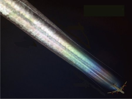 Interessant sind die Regenbogenfarben dieses Typs von Kondensstreifen. Gleich hinter dem Flugzeug sind die Eispartikel noch relativ klein und reflektieren vor allem blaues Licht, je größer die Eispartikel werden – je weiter sie vom Flugzeug entfernt sind – desto langwelliger ist das Licht, das sie reflektieren. Die Farbe der Kondenswolke verändert sich daher von blau über grün und gelb bis rot. Nach etwa 175 Metern erscheint der Kondensstreifen weiß, weil die Eispartikel nach und nach in die Turbulenzen der Wirbelschleppen hinter dem Flugzeug geraten. Dort wachsen die Eispartikel nicht mehr gleichförmig, sie reflektieren aufgrund ihrer unterschiedlichen Größen das Licht diffus in allen Wellenlängen und erscheinen damit weiß.