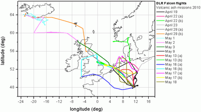 Das DLR-Forschungsflugzeug Falcon hat vom 19. April bis zum 3. Mai 2010 insgesamt neun Messflüge zur Vulkanasche-Belastung über Europa auf Grund des Ausbruchs des isländischen Eyjafjalla durchgeführt. Aus den Messungen lassen sich auch Maßnahmen für die bessere Organisation des Luftverkehrs bei Vulkanausbrüchen ableiten. In Zukunft wird es Grenzwerte für die sichere Luftfahrt geben. Die Vorhersagen müssen dann nicht nur die Anwesenheit einer Aschewolke vorhersagen, sondern auch die Masse-Konzentration, was, wie auch Modellierer in anderen Instituten betonen, viel schwieriger ist. Die Notwendigkeit für den Betrieb eines Notfall-Flugzeuges, nicht nur für Vulkanasche, sondern auch für andere Gefahren, ist klar belegt. Damit kann, wie der Fall zeigt, Milliardenschäden von der europäischen Volkswirtschaft abgewendet werden.