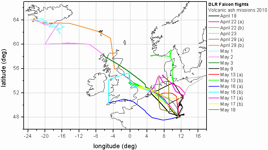Flugrouten der DLR Falcon während der Vulkanaschemission 2010