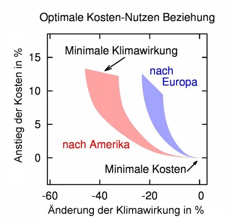 Durch die Kombination eines globalen Klima-Chemie-Modells (EMAC) mit einem Luftverkehrsmodell (SAAM) wurde für Transatlantikflüge untersucht, wie hoch das Einsparpotenzial für die Klimawirkung des Luftverkehrs durch klima-optimierte Flugrouten ist. Die Ergebnisse einer 1-Tages Studie des Nordatlantischen Flugkorridors zeigen, dass leicht veränderte Flugrouten die Effekte durch Kondensstreifen und Ozon deutlich verringern. Zwar erhöhen sich hierdurch Treibstoffbedarf und Betriebskosten geringfügig (um ca. 0.5%) doch die Verringerung der Klimawirkung (um ca. 25%) könnte dies rechtfertigen.