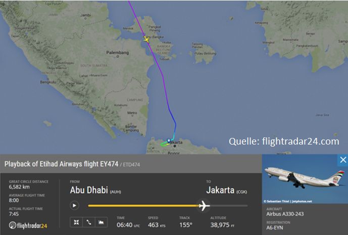 Nach den bei flightradar24.com abrufbaren Flugdaten ist das Flugzeug mit Flugnummer EY474 am 4. Mai 2016 um 07:24 UTC am internationalen Flughafen Soekarno-Hatta in Jakarta gelandet. Wenn die Information aus den Medien korrekt ist, dass sich der Zwischenfall 45 Minuten vor der Landung ereignet hat, muss die Turbulenz gegen 06:40 UTC in der Nähe der Insel Bangka, östlich von Sumatra, aufgetreten sein. Dies ist aus der folgenden flightradar24-Karte ersichtlich.