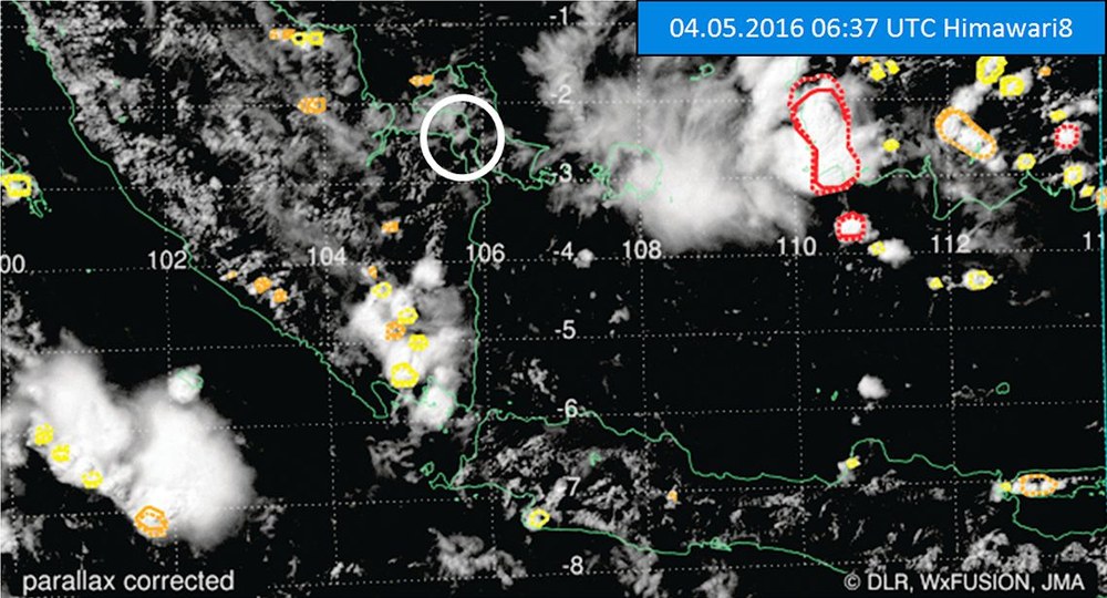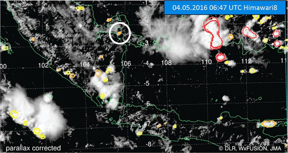 An diesem Tag lief das Gewittererkennungs- und Nowcastingsystem „Cb-global”, eine Entwicklung des DLR Instituts für Physik der Atmosphäre, operationell bei WxFUSION, einer Ausgründung des DLR. Cb-global basiert auf Satellitendaten, in diesem Fall auf in Echtzeit verfügbaren Himawari-8 Daten mit einer räumlichen Auflösung von 2 km (IR Kanäle) und einer zeitlichen Auflösung von 10 Minuten. Aufgrund dieses Zwischenfalls kamen Fragen auf, ob die Turbulenz durch ein konvektives Ereignis, also ein Gewitter, verursacht wurde und ob Cb-global in der Lage war die Gefahr zu erkennen.