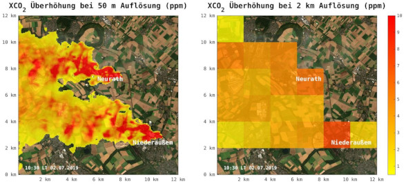 Die wissenschaftliche Leitung der Mission liegt beim Institut für Physik der Atmosphäre (IPA), deren Wissenschaftler*innen gemeinsam mit der Universität Heidelberg verschiedene Forschungsfragen zur Vorbereitung der CO2Image Mission beantworten. Eine der aktuellen Forschungsaufgaben ist es Methoden zu entwickeln, mit denen aus den Bildern der CO2 Abgasfahnen die freigesetzten Emissionen mit bestmöglicher Genauigkeit bestimmt werden können. Das DLR Institut für Optische Sensorsysteme (OS) entwickelt für die Mission ein speziell für die Vermessung von Punktquellen ausgelegtes abbildendes Spektrometer. Das COSIS genannte Instrument soll als Hauptnutzlast der Mission im Jahr 2026 ins All starten. Für die Prozessierung der wissenschaftlichen Daten sowie die Kalibrierung des Instruments ist das DLR Earth Observation Center (EOC) verantwortlich. Die CO2Image Mission, die sich derzeit in Phase B befindet, ergänzt laufende und geplante Copernicus Missionen wie Sentinel-5p und CO2M. Die aktuellen Instrumente haben typischerweise eine räumliche Auflösung von einigen Kilometern und vermessen damit äußerst präzise und flächendeckend die Treibhausgaskonzentrationen in der Erdatmosphäre. CO2Image fungiert synergetisch dazu ähnlich wie eine Lupe, indem es die Emissionen kleiner und mittlerer Kraftwerke und Industrieanlagen vermisst, welche andere Missionen nicht auflösen können. Dies gelingt durch ein neuartiges Instrumentendesign mit einer vergleichsweise hohen räumlichen Auflösung von 50 m. Abbildung 2 verdeutlicht den Unterschied in der räumlichen Auflösung am Beispiel der Emissionen der Kraftwerke Neurath und Niederaußem. Diese ist auch der entscheidende Vorteil bei der Detektion von Emissionen aus CO2–Punktquellen: Die Konzentrationsüberhöhung pro Pixel ist um ein Vielfaches höher, da das CO2-Signal nur über eine kleine Fläche gemittelt wird und somit deutlich leichter messbar ist. Zudem ermöglicht die hohe räumliche Auflösung auch die Trennung der Emissionen von nahe beieinander liegenden Emittern.
