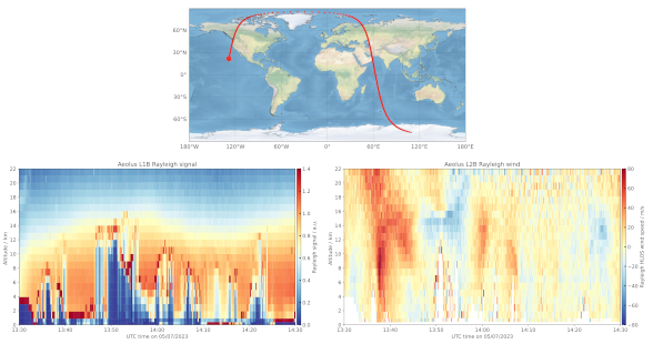 Nachdem der operationelle Betrieb der ESA-Mission bereits am 30. April 2023 beendet worden war, wurde im Mai und Juni eine Vielzahl dedizierter Tests, so genannte End-of-Life-Aktivitäten, durchgeführt mit dem Ziel, wichtige wissenschaftliche und technologische Erkenntnisse für zukünftige Lidarmissionen im Weltraum wie EarthCARE und Aeolus-Nachfolger zu sammeln. Neben Sensitivitätsanalysen verschiedener Instrumentenparameter, insbesondere zur Justage, wurde das Leistungsmaximum des Lasers ausgereizt. So wurde die Energie der ultravioletten Laserpulse, die während des operationellen Betriebs zwischen 40 und 100 mJ lag, in den letzten Tagen vor dem Abschalten auf 182 mJ erhöht. Damit wurde ein neuer Rekord für einen UV-Laser im Weltraum aufgestellt. Dank einer wolkenfreien Atmosphäre konnten die letzten von insgesamt mehr als 7,3 Milliarden Laserpulsen seit August 2018 ungehindert in den Pazifischen Ozean zwischen Nordamerika und Hawaii eintauchen und finale Windprofile mit kompletter Abdeckung vom Boden bis in die untere Stratosphäre liefern (siehe Abb. 1).