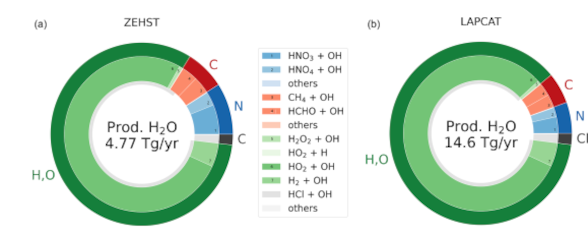 Mit zwei unterschiedlichen Klima-Chemie-Modellen wurde die Wirkung dieser Wasserdampfemissionen auf die Atmosphäre untersucht (Abb. 2). Es zeigt sich, dass die trockene Stratosphäre durch die Emissionen dieser Flugzeuge deutlich feuchter wird und dass bei einer größeren Flughöhe, die Akkumulation des Wasserdampfs deutlich größer ist. Diese Ergebnisse sind überraschend, da eigentlich in diesen Höhen Wasserdampf durch eine sehr aktive Photochemie chemisch rasch abgebaut wird und die Akkumulation gering ausfallen sollte. Diesen Abbau bestätigen die Modelle auch, jedoch führt eine Rekombination der Abbauprodukte wieder zu Wasserdampf, gleichzeitig wird mehr Methan abgebaut, das ebenfalls zu einer Produktion von Wasserdampf führt. Diese chemischen Prozesse (Abb. 3) überkompensieren damit den ursprünglichen Abbau von Wasserdampf in diesen großen Höhen. Damit konnte deutlich gezeigt werden, dass die Flughöhe ein entscheidender Faktor für die Wasserdampfanreicherung in der Stratosphäre ist. Dies hat eine deutliche Auswirkung auf die Klimawirkung potentieller Hyperschallflotten. Eine genauere Untersuchung der Klimawirkung hat ergeben, dass diese etwa 10- bis 20-mal so groß ist, wie die Klimawirkung eines repräsentativen Flugzeuges mit einer üblichen Fluggeschwindigkeit. Dies sind wichtige Erkenntnisse, die in dem EU-Projekt MOREandLESS verwendet werden, um die Klimawirkung durch die Wahl niedrigerer Flughöhen und anderer Treibstoffe deutlich zu minimieren.
