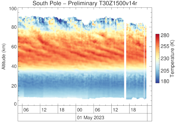 TELMA wird von einem Techniker der Amundsen-Scott South Pole Station gestartet und von uns am IPA überwacht. Es misst die atmosphärische Dichte und Temperatur bis zu einer Höhe von fast 100 km. Die Temperaturschwankungen werden durch atmosphärische Dynamik verursacht, zum Beispiel durch Schwerewellen, planetarische Wellen, Gezeiten, Instabilitäten und vielleicht auch durch noch unbekannte Phänomene. Die Dynamik der mittleren Atmosphäre beeinflusst die höheren Atmosphärenschichten, die Thermosphäre und Ionosphäre, und damit das Weltraumwetter. Zu bestimmen, welche Prozesse genau an diesem besonderen Ort auftreten und welche Eigenschaften sie haben, ist die Aufgabe von TELMA. Die ersten Messungen innerhalb des sich bildenden Polarwirbels zeigen mesosphärische Schwerewellen, deren Anregungsmechanismus noch untersucht werden muss (Abb. 2).