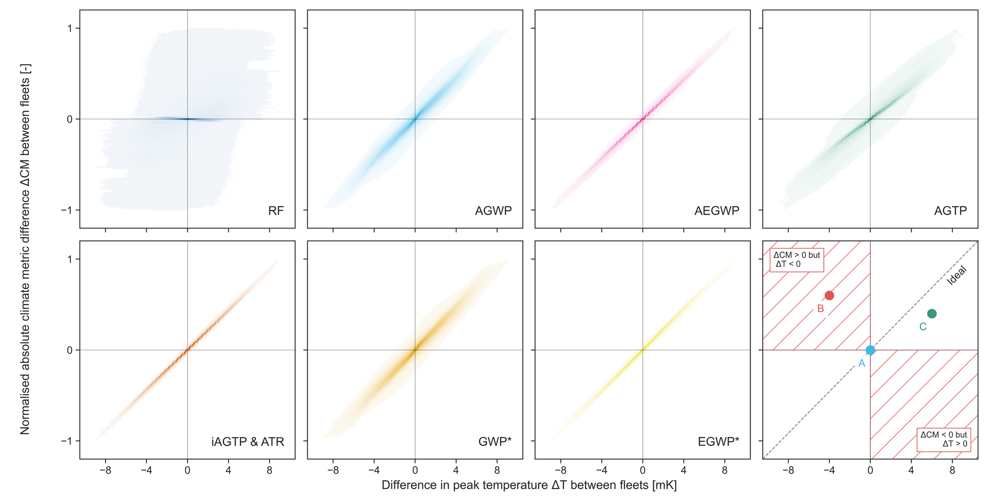Paarweiser Vergleich zweier beliebiger Flugzeugdesigns unter Verwendung verschiedener Klimametriken mit 100-jährigen Zeithorizonten. Ein Beispiel für eine Flugzeugpaarung ist im Feld unten rechts dargestellt: Neutralität wird für die Paarung von Flugzeug A und Flugzeug C angezeigt, aber nicht für die Paarung A-B, da der Wert der Klimametrik höher, die Spitzentemperatur aber niedriger ist. Eine ideale Klimametrik würde eine diagonale Linie von unten links nach oben rechts zeigen. EGWP* ist die neutralste Klimametrik, aber nicht mit der bestehenden Klimapolitik vereinbar. ATR und EGWP schneiden am besten ab.