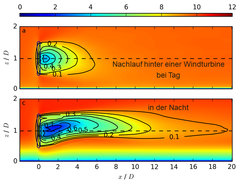 Für Anwendungen im Bereich der Windenergie wird das Modell EULAG (Eulerian/semi-Lagrangian numerical model for fluids) im LES-Modus mit verschiedenen am Institut für Physik der Atmosphäre entwickelten Modulen betrieben. Dabei geht es um das Prozessverständnis der Interaktion einer rotierenden Windturbine mit der stark variablen Strömung in der atmosphärischen Grenzschicht, z.B. durch Tag-Nacht-Unterschiede, die die Länge des Nachlaufs hinter der Turbine beeinflussen, durch Einflüsse thermischer Schichtung und Winddrehungen sowie orografischer und topografischer Effekte.