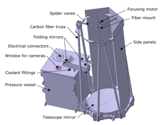 Techische Zeichnung des Druckbehälters von BOLIDE mit Laser und Empfangselektronik und dem Empfangsteleskop.