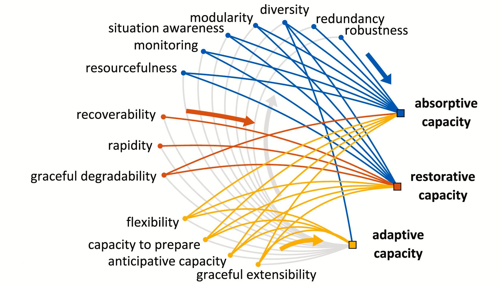 Farbige Pfeile verdeutlichen die Verbindungen zwischen den Systemfähigkeiten auf der einen Seite und den drei fundamentalen Resilienzkapazitäten auf der anderen Seite. Die grauen Pfeile im Hintergrund zeigen wie die Anpassungsfähigkeiten des Systems, die adaptive Kapazität, jegliche anderen Systemfähigkeiten stärken können.