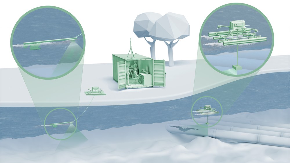 Sonarsysteme werden in der Regel per Schiff zum Einsatzort transportiert. Das ist meist aufwändig, zeitintensiv und bindet wichtiges Einsatzpersonal. Die vom DLR-Institut für den Schutz terrestrischer Infrastrukturen entwickelten Sonardrohnensysteme hingegen sind schnell einsatzbereit und können eigenständig zum Einsatzort fliegen. Die Systeme lassen sich von nur zwei Personen mit einer handelsüblichen, ferngesteuerten Drohne in Betrieb nehmen und bedienen.