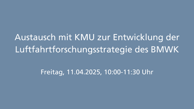 Wenn Sie ein KMU sind und Interesse an einer Teilnahme an dieser Veranstaltung haben, schicken Sie uns bitte eine E-Mail an kmu-beratung-luftfahrt@dlr.de, damit wir Ihnen die Einwahldaten zusenden können.