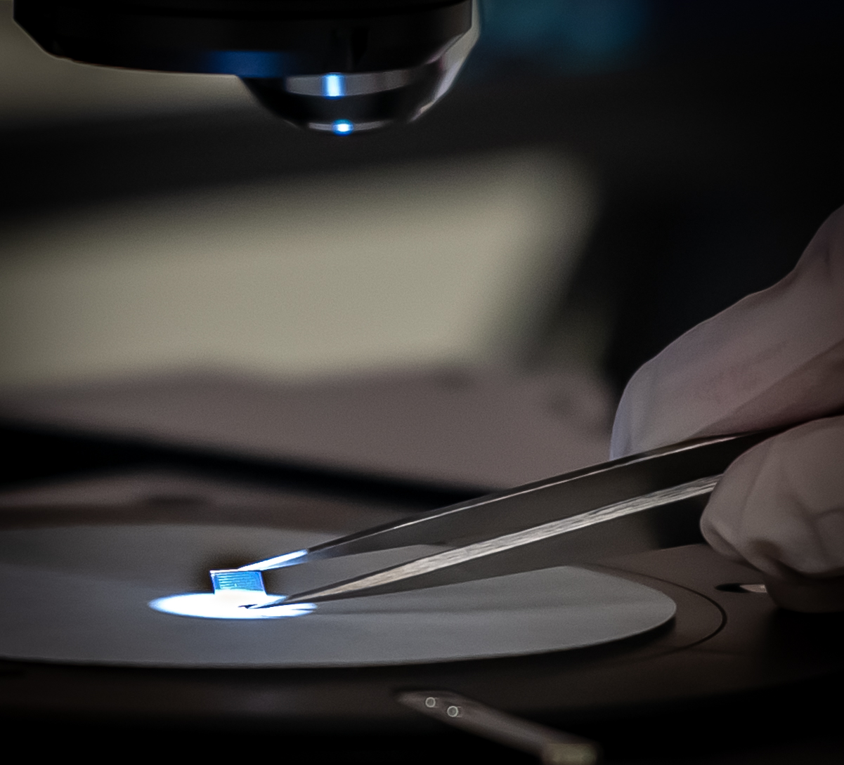 Diamant mit Stickstofffehlstellen und Lithographiemaske unter optischen Mikroskop