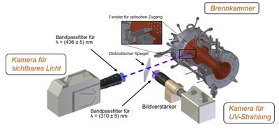 - Strömungsvisualisierung mithilfe klassischer und Background-Oriented-Schlieren-Technik (BOS): Verschiedene Eigenschaften wie Dichte, Temperatur oder Stoffzusammensetzung in einem Strömungsfeld, können sichtbar gemacht werden. Es handelt sich in der Regel um qualitative Messungen dieser Größen, die Erfassung ihrer räumlichen Verteilung liefert jedoch essenzielle Informationen zur Beurteilung der Strömungs- und Mischungsvorgänge. Unterschiedliche Fluide, Dichte und Temperaturänderungen in einem Strömungsfeld können mit den damit verbundenen Unterschieden im Brechungsindex sichtbar gemacht werden. Verschiedene Verfahren wie die Schlieren- und Schattenfotografie oder das Durchlichtverfahren kommen dabei zum Einsatz. Die Brennkammern werden dazu mit Fenstern ausgestattet, die den optischen Zugang zum Strömungsfeld gewährleisten.
