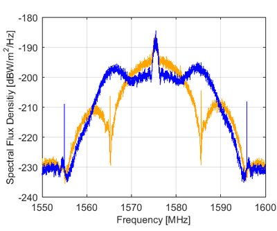 GPS-Satelliten verfügen über die Fähigkeit, die Sendeleistung zwischen den verschiedenen Signalkomponenten umverteilen zu können. Diese sogenannte Flex Power kann sowohl mit GNSS-Empfängern als auch mit der Parabolantenne in Weilheim beobachtet werden und wird seit 2017 in verschiedenen globalen und regionalen Ausprägungen verwendet. Abbildung 2 zeigt den Einfluss von Flex Power auf die in Weilheim gemessene Leistungsspektraldichte. Hier wurde das M-Code Signal deaktiviert, dadurch verschwinden die beiden Nebenmaxima bei 1566 und 1585 MHz und die Leistung des P-Code Signals mit einer Mittenfrequenz von 1575.42 MHz wurde um ca. 6 dB angehoben.
