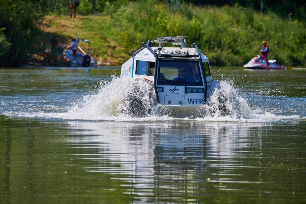 In einer Live-Demonstration am 25. Juni 2024 führte das Projekt AHEAD (Autonomous Humanitarian Emergency Aid Devices) Hochtechnologien für die humanitäre Hilfe und den Katastrophenschutz vor. Das Institut für Robotik und Mechatronik entwickelt als Teil des Deutschen Zentrums für Luft- und Raumfahrt (DLR) und anderen Partnern gemeinsam Technologien und Fähigkeiten für ferngesteuerte fahrerlose Transportfahrzeuge, die schwer zugängliche Gebiete erschließen. Die Offroad-Fahrzeuge erreichen Orte, die für Boote oder Straßenfahrzeuge zu unwegsam oder für Menschen zu gefährlich sind. Ziel ist es, humanitäre Hilfe und Katastrophenhilfe dort zu unterstützen, wo Einsatzkräfte nicht mehr alleine weiterkommen.