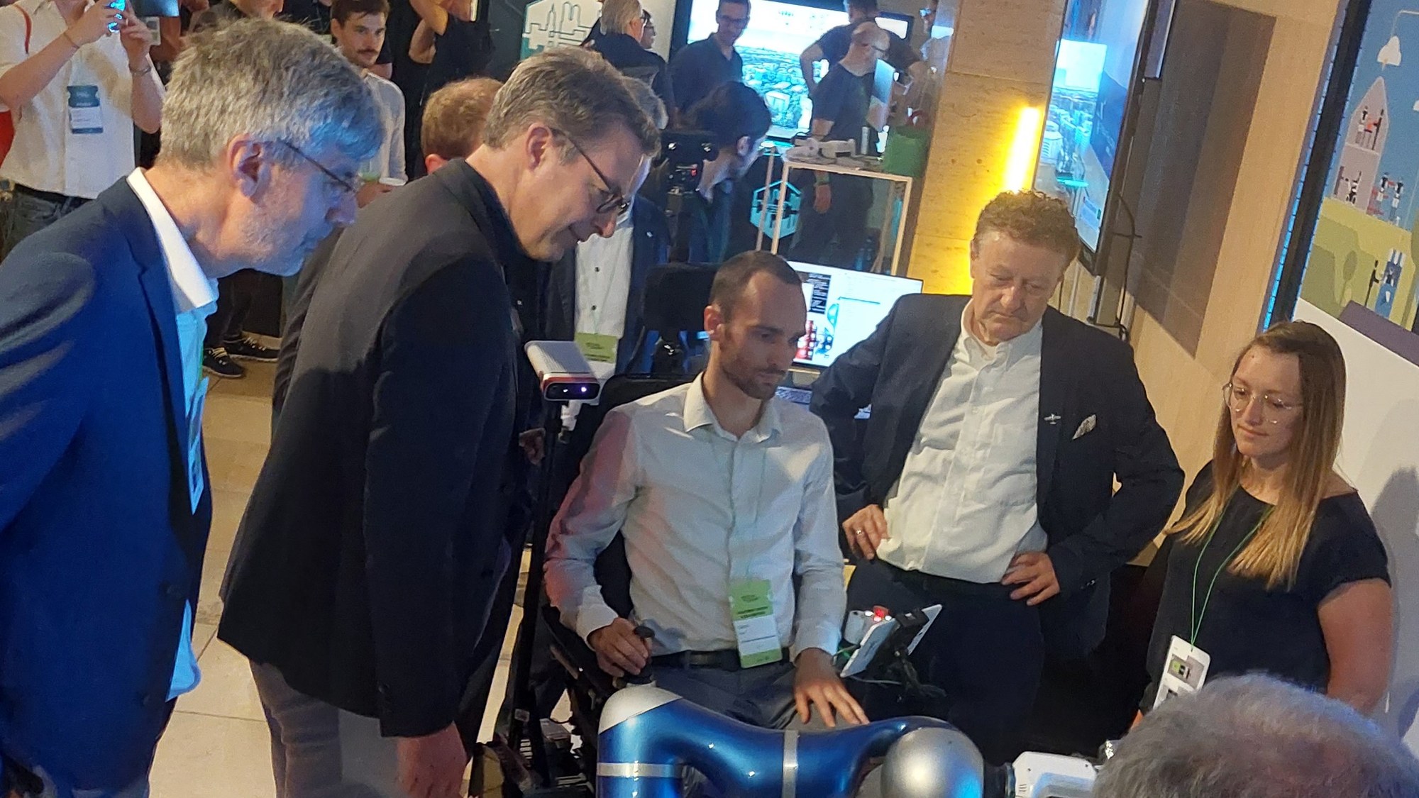 Staatsminister Markus Blume besichtigt das Pflegeassistenzsystem EDAN auf dem Festival der Zukunft