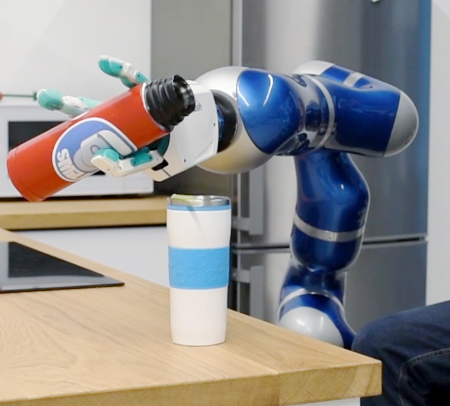 Der Assistenzroboter EDAN füllt, vom Rollstuhl aus gesteuert, einen Trinkbecher. Mit dieser Technologie kann Menschen mit starken körperlichen Einschränkungen wieder ein hohes Maß an Eigenständigkeit im Alltag gegeben werden.