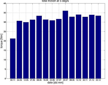 Die Ergebnisse der On-Orbit-Identifikation zeigen, dass sich die Gesamtreibung für Gelenk 1 im Weltraum um einen Faktor von etwa 50 % erhöht hat, verglichen mit der Reibung am Boden, gemessen bei 20°C und normalem atmosphärischen Druck. Allerdings ist im ersten Betriebsjahr bisher nur eine geringe weitere kontinuierliche Veränderung der Parameter zu beobachten (siehe Abbildung unten). Dies legt den Schluss nahe, dass das Schmiermittel seine Eigenschaften veränderte, als es zu Beginn der Mission den Bedingungen im Weltraum ausgesetzt war, und danach einen Betriebszustand mit langsamen Parameteränderungen erreichte.