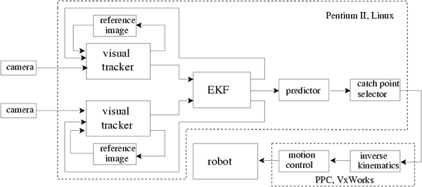 One objective of this system was to show that 3D visual tracking of a flying object is possible without making strong assumptions on the environment and using only off-the-shelf components like a PC (Pentium II/300MHz) and standard video cameras and framegrabbers with a frame rate of 50Hz.