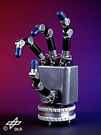 Die DLR Hand I war der direkte Vorläufer der DLR Hand II. Jeder Finger weist ein kardanisches Grundgelenk mit zwei Freiheitsgraden auf, das über speziell konstruierte Linearaktuatoren (künstliche Muskeln) und einen dritten, im unteren Fingerglied integrierten Aktuator dieser Art realisiert wird, und so das zweite Glied aktiv und das dritte Glied über eine durchdachte Federverbindung passiv bewegt. Die anthropomorphen Fingerspitzen sind entscheidend für das Greifen und Handhaben bzw. die Manipulation, weshalb sie modular aufgebaut und problemlos gegen speziell angepasste Ausführungen ausgetauscht werden können. Im Einklang mit unseren mechatronischen Konstruktionsprinzipien ist praktisch jeder Quadratmillimeter in den Fingern mit Sensor-, Aktuator- und elektronischer Vorverarbeitungstechnik belegt.