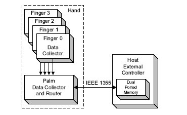 Um Daten zu sammeln und zu übertragen, wurde ein hierarchisches serielles Kommunikationssystem in der Handfläche und den Fingern der DLR Hand II implementiert. Es ist in FPGAs gemäß dem IEEE 1355 Standard implementiert, der eine schlanke Protokollschicht spezifiziert, Kollisionen verhindert und verschiedene physikalische Übertragungsmedien unterstützt. Die Zeichenverbindungen des Netzwerks werden mit Daten- und Strobe-Leitungen in beide Richtungen realisiert, so dass sich vier Leitungen ergeben. Ein Heartbeat-Ereignis aktiviert den Datensammler, um die Daten des gemeinsamen Speichers von einem Paket zu übernehmen und an den Host zu senden. Ein spezielles Zeichen mit hoher Priorität wird verwendet, um das Heartbeat-Ereignis an alle Datensammler zu übertragen, um das System in Echtzeit zu synchronisieren. Ein Host-Interface-Controller mit einer Dual-Ported-Memory-Schnittstelle zur Host-CPU verarbeitet die eingehenden Pakete mit den Sensorwerten, bereitet die ausgehenden Pakete mit den Aktuatorwerten vor, um sie an die Datensammler zu senden, und erzeugt das Heartbeat-Ereignis zur Synchronisierung des Systems. In DLR Hand II ermöglicht eine physikalische Datenrate von 10 Mbits einen vollen Zyklus, in dem Sensordaten abgetastet und Aktuatorwerte jede Millisekunde berechnet und eingestellt werden.