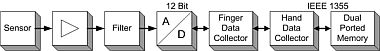 Um eine sensible Interaktion mit der Umgebung zu ermöglichen, wurde die DLR Hand II mit verschiedenen Sensoren zur Messung von Position, Geschwindigkeit, Gelenkdrehmoment und Temperatur ausgestattet. Der Aufwand für die Erfassung und Aufbereitung eines bestimmten Sensorsignals richtet sich nach der beabsichtigten Verwendung dieser Daten. Die physikalischen Daten des Sensors, z.B. der Spannungsausgang eines Potentiometers, werden der Sensorsignalvorverarbeitung zugeführt. Diese befindet sich direkt neben dem Sensor selbst und besteht aus einem Impedanzwandler und einem Instrumentenverstärker mit einem Butterworth-Tiefpassfilter dritter Ordnung. An diese Schaltung schließt sich ein 12-Bit-A/D-Wandler an, der so nah wie möglich an den Schaltungen zur Sensorsignalaufbereitung in jedem Fingerglied angeordnet ist, um den Verkabelungsaufwand und die Rauschinduktion gering zu halten. Die Wandler werden asynchron mehr als zehnmal schneller abgetastet als die eigentliche Taktrate des Steuersystems, wodurch ein quasi kontinuierlicher Datenstrom gewährleistet wird und Raum für weitere Erweiterungen bleibt. Die Daten werden über eine serielle Kommunikationsverbindung an einen in einem FPGA implementierten Fingerdatensammler gesendet. Jeder Finger-Datensammler leitet seine Daten seriell an den Hand-Datensammler weiter, der alle gesammelten Daten an die Dual-Ported-RAM-Karte weiterleitet. Der Einfachheit halber verwenden alle Sensoren unabhängig von ihrem tatsächlichen Auflösungsbedarf die gleichen 12-Bit-A/D-Wandler. Daher ist jedes bewegliche Glied des Fingers mit einem 8-Kanal 12-Bit A/D-Wandler ausgestattet. Auf der nicht beweglichen Basisplatine jedes Fingers befinden sich zwei dieser A/D-Wandler. Insgesamt ergibt dies fünf Wandler pro Finger, die 40 Kanäle bereitstellen. Derzeit werden 25 Kanäle verwendet, so dass 15 Kanäle für weitere Anwendungen wie zusätzliche taktile Sensoren zur Verfügung stehen.