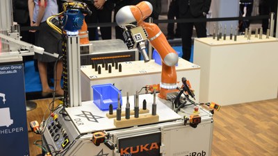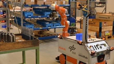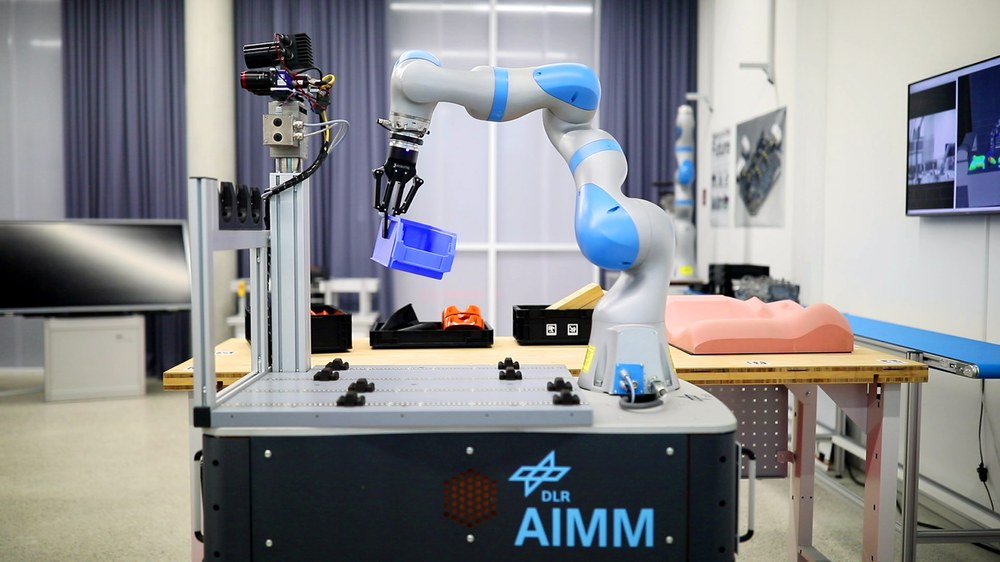 Der Roboter AIMM (Autonomer Intelligenter Mobiler Manipulator) ist ein Forschungsprototyp, der am Institut für Robotik des Deutschen Zentrums für Luft- und Raumfahrt entwickelt wird. Der mobile Manipulator verfügt über einen integrierten Software-Stack für den autonomen Betrieb, welcher Wahrnehmung, logisches Denken und Manipulation integriert. AIMM eignet sich hervorragend für die Laborautomatisierung und künftige Produktionsszenarien. Sein Fokus liegt in der Handhabung und Manipulation von artikulierten Objekten, wie z.B. Laborgeräten.