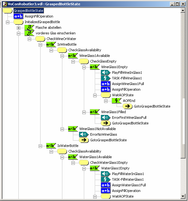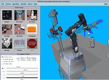 Für die flexible Programmierung von Manipulationsaufgaben verwenden wir beim Robutler dasselbe System wie bei unseren Tele- und Weltraumrobotikexperimenten. Die Manipulationsaufgaben werden in einer grafischen Benutzeroberfläche aus so genannten Elementaraktionen zusammengesetzt. Diese Elementaraktionen vereinen Sensorinformationen, Regelungsstrategien und grundlegende kartesische oder Gelenkwinkelbewegungen, die vom Systemsetup bereitgestellt werden. So könnte das Reichen und Greifen einer Flasche zum Beispiel aus diesen drei Grundaktionen bestehen: