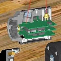 Die auf drei Platinen aufgeteilte Elektronik des Abtastkopfs steuert ebenfalls die Laserdiode, die Datenübertragung und die berührungslose, induktive Energieversorgung. Die bidirektionale Datenübermittlung für die Verbindung von Rotationsabtastkopf und Chassis wird über die LWL-Komponenten von ELCOS realisiert. Mit diesen IR-Sender/Empfänger-SMDs ist eine Übertragungsrate von 1 Mbit/s möglich. Die kontaktlose Datenübermittlung garantiert den verschleißfreien und robusten Systembetrieb. Die Energieversorgung des Abtastkopfs ist ebenfalls kontaktlos ausgeführt. Zwei in Ferritkerne eingebettete Transformatorspulen sind vis-à-vis im Abtastkopf und im Chassis verbaut. Der Luftspalt zwischen den beiden Kernen kann auf einen Wert von weit unter 0,1 mm eingestellt werden. Hier ist die montierte Einheit zur Leistungs- und Datenübertragung dargestellt.