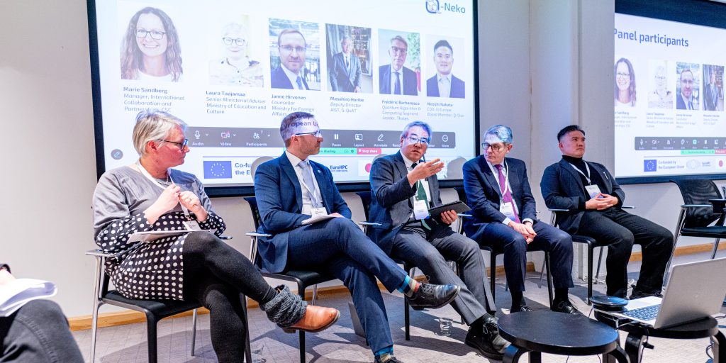 Q-NEKO Panel discussion, 10.2.2026 in Helsinki. The panelists: Frédéric Barbaresco, Thales, France, Janne Hirvonen, Ministry of Foreign Affairs, Finland, Masahiro Horibe, AIST, Japan, Hiroshi Nakata, Q-Star, Japan, and Laura Taajamaa, Ministry of Culture and Education, Finland.