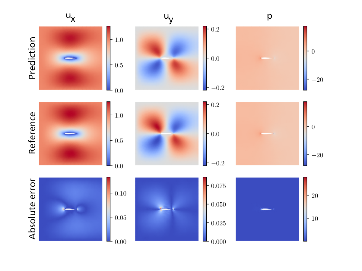 Vergleich der Geschwindigkeit in x- und y-Richtung und des Drucks zwischen der Lösung eines hybriden Vorhersagemodells und einer numerischen Lösung um ein Flugzeugflügel