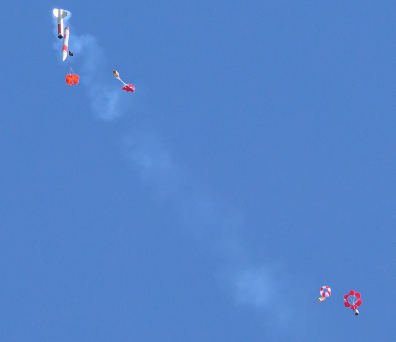 Links oben im Bild sind die Rakete und ein Dosensatellit zu sehen, deren Fallschirme sich gerade öffnen. Rechts unten im Bild sind zwei Dosensatelliten mit bereits geöffnetem Fallschirm, an dem sie zu Boden schweben.
