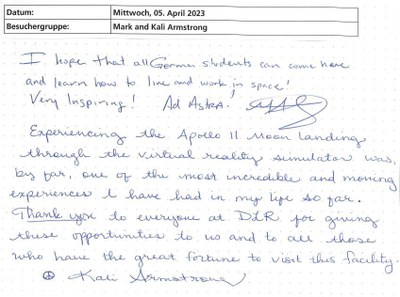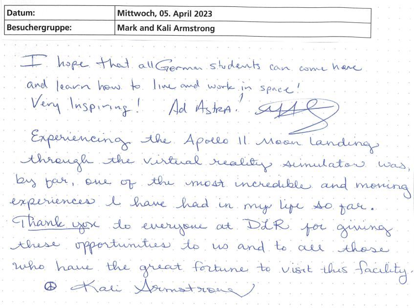 Wie ihr Vater und Großvater Neil vor rund 50 Jahren, besuchten Mark und Kali Armstrong am 5. April 2023 den Standort Braunschweig des Deutschen Zentrums für Luft- und Raumfahrt (DLR). Und wie bei Neil liegt auch den beiden Nachkommen die Inspiration der Menschen und insbesondere des Nachwuchses am Herzen. Folgerichtig stand auch das DLR_School_Lab auf dem Besuchsprogramm. „Egal, ob Weltraumspaziergang mit VR-Brille, Experimente in Schwerelosigkeit oder Strömungsversuche im Windkanal – Inspiration ist die Quelle für Motivation und Begeisterung für die MINT-Fächer und eine spätere wissenschaftliche Karriere. Genau das wollen wir den Schülerinnen und Schülern in unserem Schülerlabor mitgeben“, sagt Frank Fischer, der Leiter des DLR_School_Lab Braunschweig, und ergänzt: „Vielleicht hatten wir auch schon einen jungen Menschen bei uns zu Gast, der in Zukunft mal den Mond oder Mars betreten wird.“ Um die Chancen zu erhöhen, betreibt das DLR teils an eigenen Standorten, teils in Kooperation mit befreundeten Hochschulen insgesamt 16 DLR_School_Labs in Deutschland.