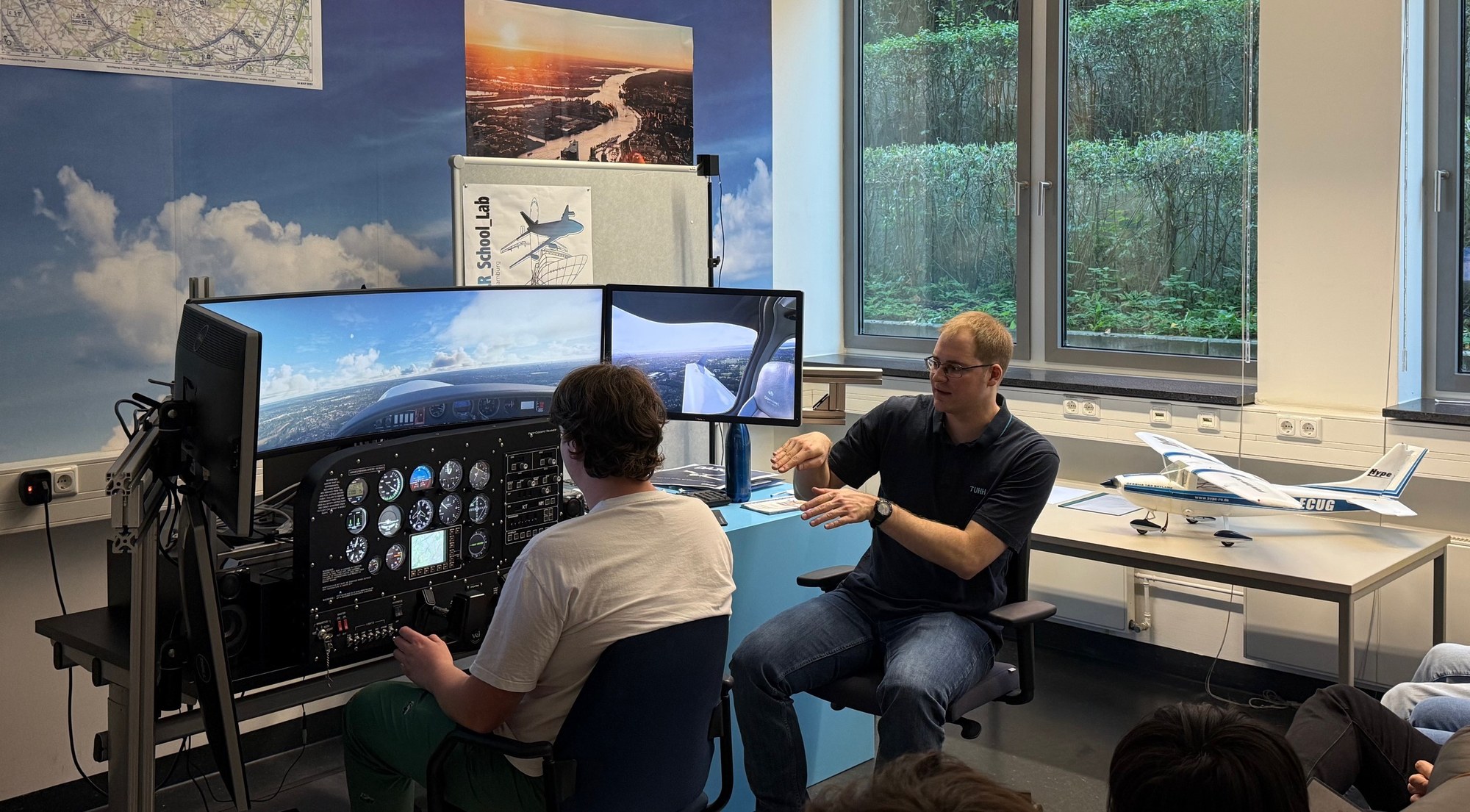 Flugstunde am Flugsimulator des DLR_School_Lab TU Hamburg mit DLR-Mitarbeiter André Koloschin (rechts)