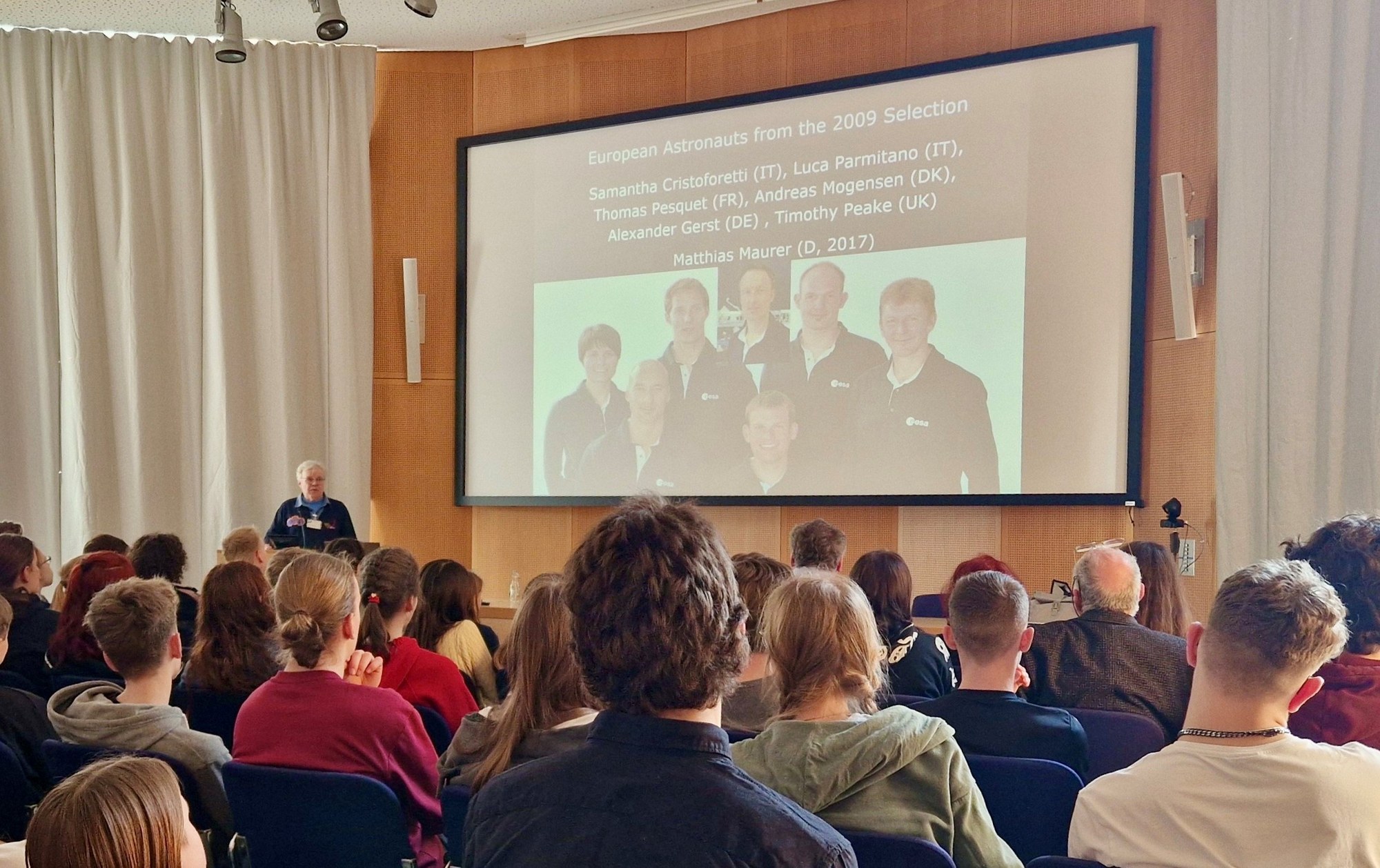 Prof. Dr. Reinhold Ewald präsentiert den Schülerinnen und Schülern faszinierende Einblicke in die Raumfahrtgeschichte – die Jugendlichen und ihre Lehrkräfte hören gespannt zu.