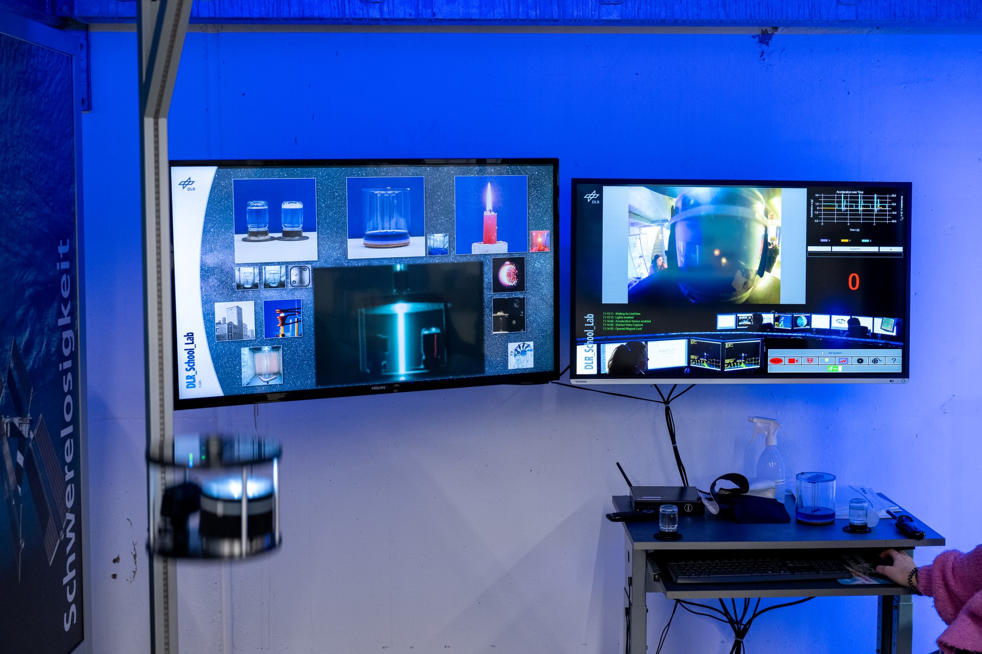 Der Experimentstand zum Thema Schwerelosigkeit mit herabfallender Kapsel (links). Bei dem Abwurf wird untersucht, wie eine Kerzenflamme in Schwerelosigkeit brennt. Diese Erkenntnisse werden genutzt um beispielsweise Verbrennungsprozesse von Treibstoffen zu optimieren.